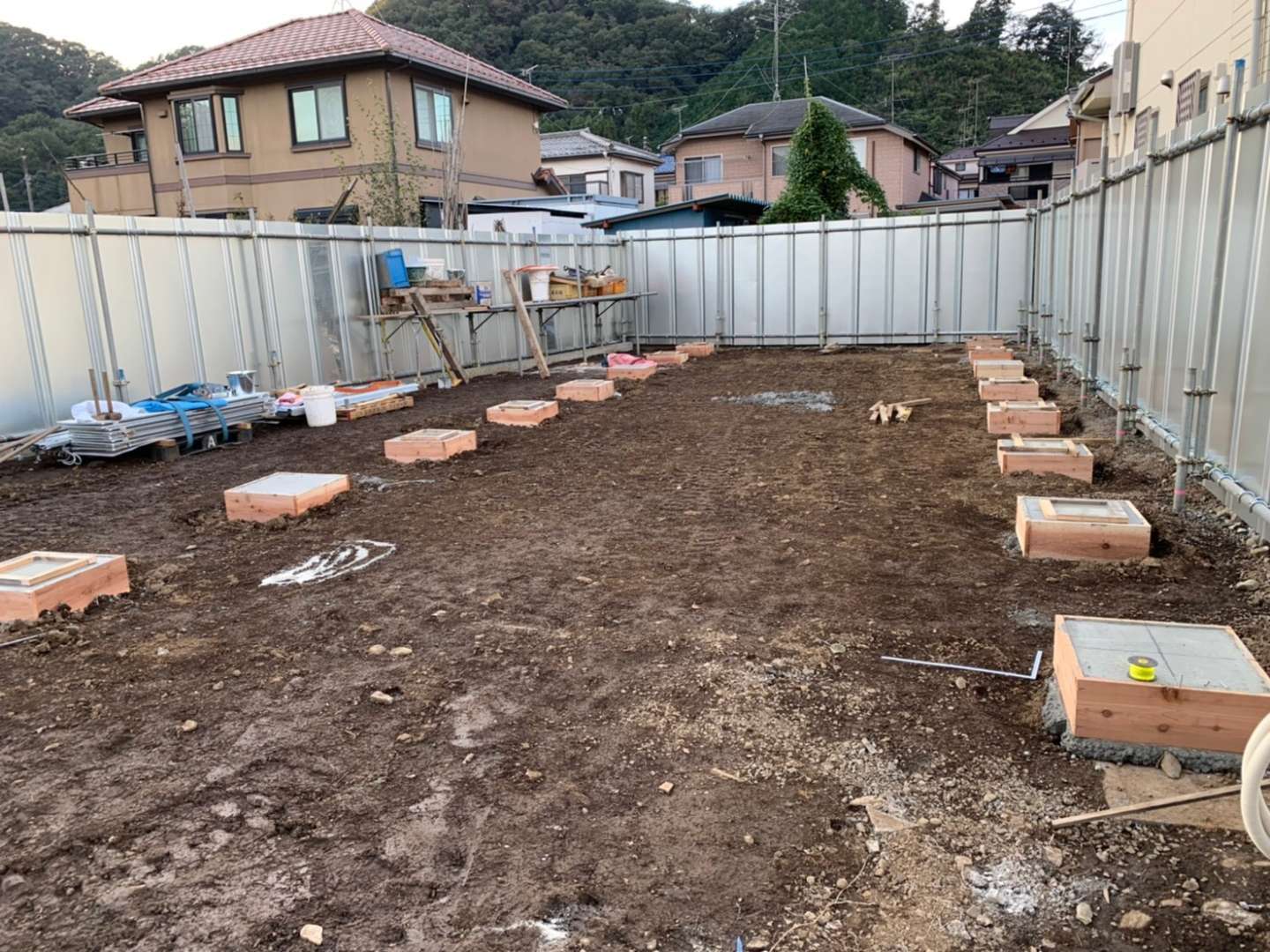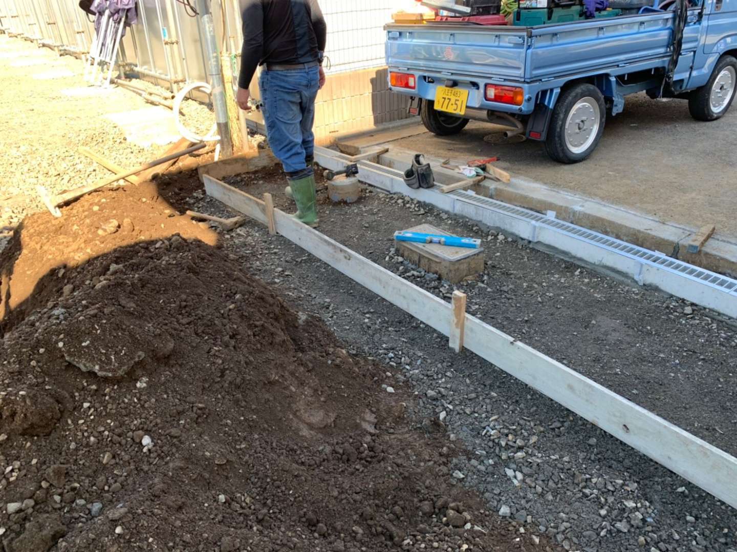 また、足元が土のままだと雨でドロドロになってしまうため、置場全体に砕石を敷き、均(なら)します。