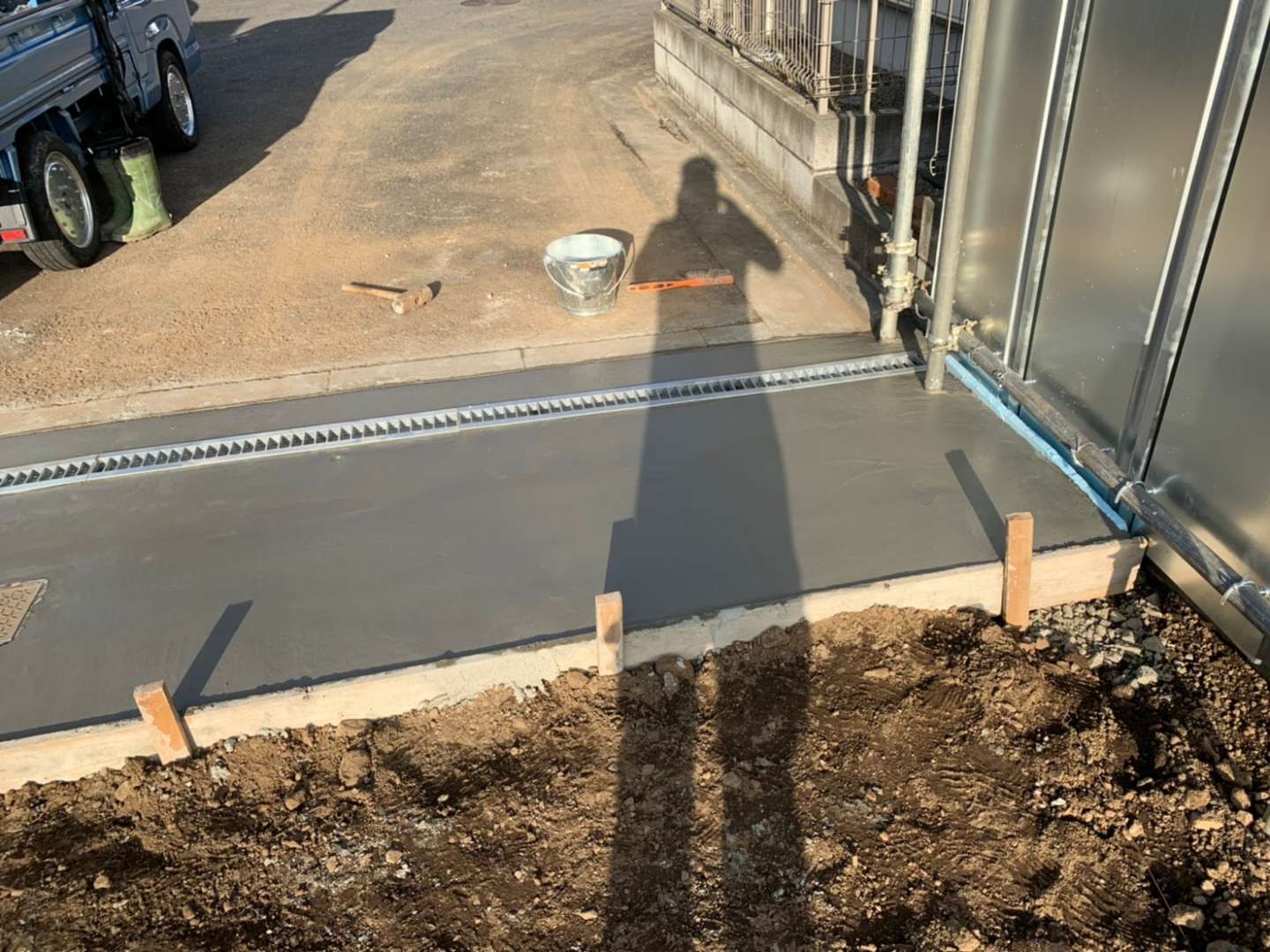 万が一、入り口の外に土や汚れが流れてご近所様に迷惑をかけないように、小さめのU字溝も設置しました。